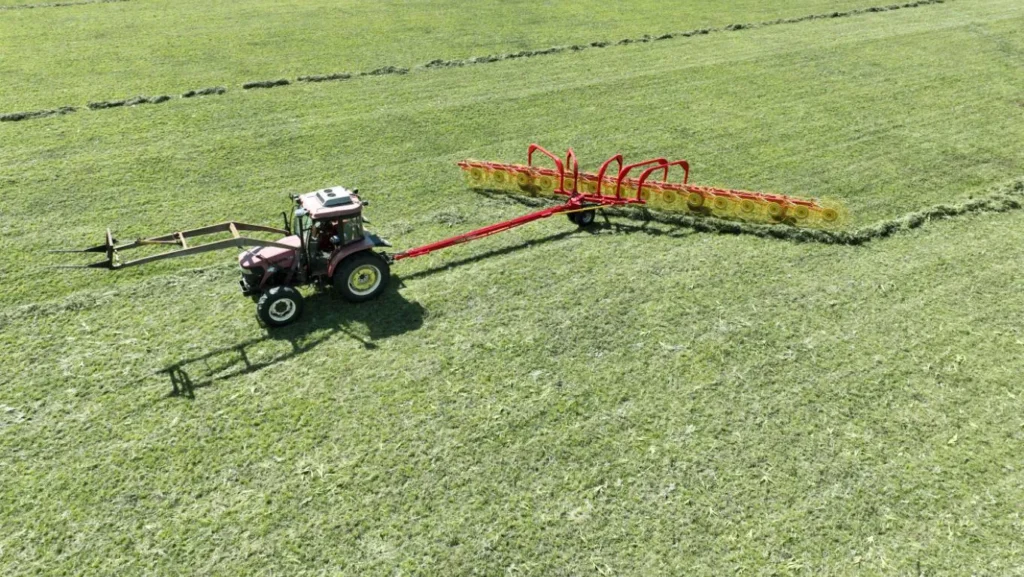 9LZY-9.0 Finger-Disk Rake (15 Discs): A high-capacity rake covering a 9-meter width with hydraulic lifting finger discs for uniform windrows and excellent air permeability.